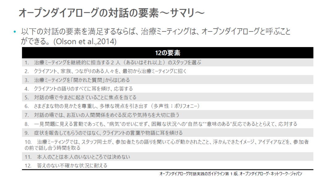 - 対話の原則12か条を通じて、オープンダイアローグの基本に立ち返ることができた